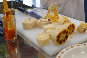 - れんこんは皮をむき、レンコンの穴にうにを詰め薄切りにする