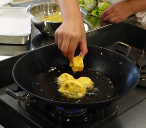 - 薄切りにしたレンコンを2)の中につけ、170℃の油でさくっとあげる
